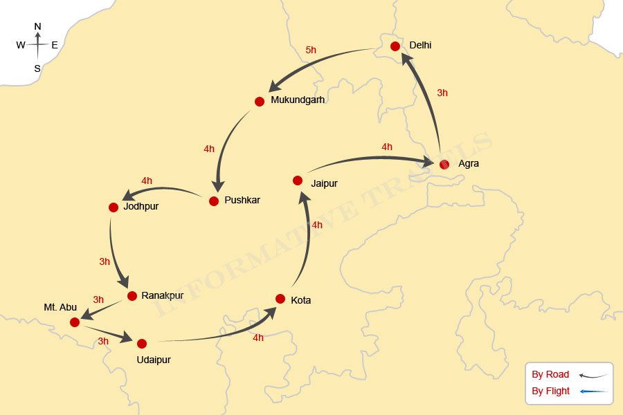 Delhi - Mukandgarh - Pushkar - Jodhpur - Ranakpur - Mt. Abu - Udaipur - Kota - Jaipur - Agra - Delhi
