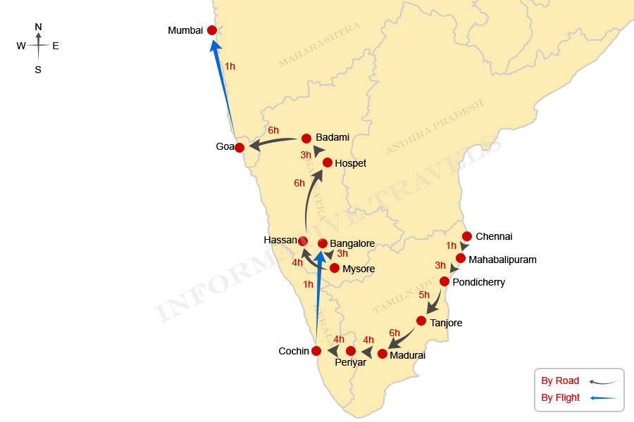 Chennai - Mahabalipuram - Pondicherry - Tanjore - Madurai - Periyar - Cochin - Bangalore - Mysore - Hassan - Hospet - Badami - Goa - Mumbai